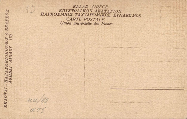Πίσω όψη: Το δελτάριο στάλθηκε από την Ελλάδα στη Γαλλία. Έκδοση του Α. Β. Πάσχα στην Αθήνα.