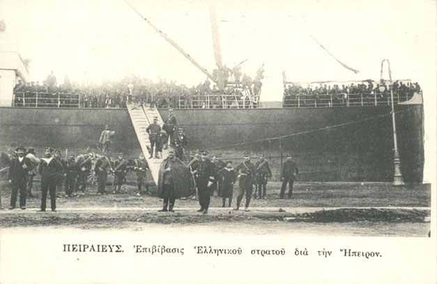 Πειραιάς. Έλληνες στρατιώτες επιβιβάζονται σε πλοίο, για να μεταφερθούν στο Μέτωπο της Ηπείρου.