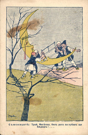Επιστολικό δελτάριο όπου απεικονίζεται ο Νικήτας (ή Νικόλαος), ηγέτης του Μαυροβουνίου, έφιππος, κρατώντας το ξίφος του. Κοιτάζει υποτιμητικά την Τουρκική σημαία που την πατούν οι μπροστινές οπλές του αλόγου του.