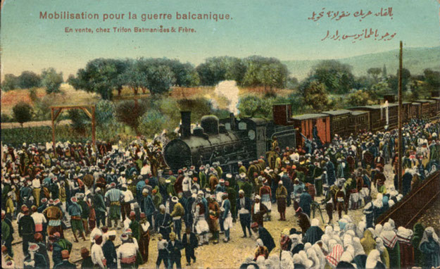 Επιστολικό δελτάριο. Διαστ. 136Χ85 χιλ. Εικόνα εύγλωτη σε σταθμό τρένων κατά την στρατιωτική κινητοποίηση – επιστράτευση με την έναρξη των Βαλκανικών πολέμων.