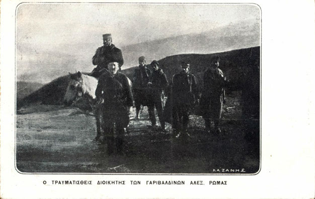 Επιστολικό δελτάριο. Διαστ. 143Χ91 χιλ. Κατά τον Α΄ Βαλκανικό πόλεμο ο Έλληνας λοχαγός, Γαριβαλδινός, Αλέξανδρος Ρώμας, σχημάτισε φάλαγγα Ελλήνων ερυθροχιτώνων που θα ενωνόταν με αντίστοιχο τάγμα Ιταλών Γαριβαλδινών που έσπευσαν στην Ελλάδα. Μετά τη συγκρότηση της νέας φάλαγγας, αυτή προωθήθηκε στο μέτωπο της Ηπείρου, όπου κατά τη διάρκεια της μάχης του Δρίσκου δέχθηκε μεγάλη εχθρική πίεση.