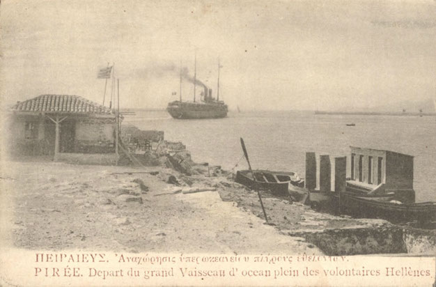 1912. Ακτή του Πειραιά. Στο βάθος το υπερωκεάνειο που μετέφερε Έλληνες εθελοντές από την Αμερική για τους Βαλκανικούς αγώνες.