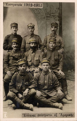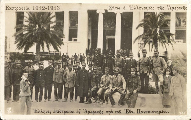 Επιστολικό δελτάριο. Διαστ. 88Χ140 χιλ. Με την ευκαιρία της επιστράτευσης έσπευσαν να καταταγούν πολλοί Έλληνες εθελοντές που ζούσαν στο εξωτερικό, καθώς και αρκετοί φιλέλληνες, με αποτέλεσμα να καλυφθούν όλες σχεδόν οι ελλείψεις των μονάδων σε προσωπικό. Εδώ Έλληνες επίστρατοι από την Αμερική.