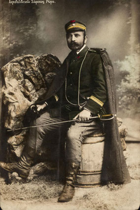 Εδώ ο Συνταγματάρχης Αλέξανδρος Ρώμας με τη στολή των Ερυθροχιτώνων Γαριβαλδινών και το ξίφος του στο χέρι. Ο Γαριβαλδινοί φορούσαν κόκκινο χιτώνιο, για να μη φαίνεται το αίμα σε περίπτωση που τραυματίζονταν την ώρα της μάχης. Έτσι, θα απέφευγαν τη λιποψυχία οι ίδιοι και οι συμπολεμιστές τους. Λέγεται πως μάχονταν όρθιοι, δείχνοντας περιφρόνηση στο θάνατο. Οι Κρήτες εθελοντές συμπολεμιστές τους στη μάχη του Δρίσκου τους αποκαλούσαν πειραχτικά «προδότες», αφού η κατακόκκινη στολή τους πρόδιδε και τους έκανε εύκολο στόχο για τους εχθρούς.