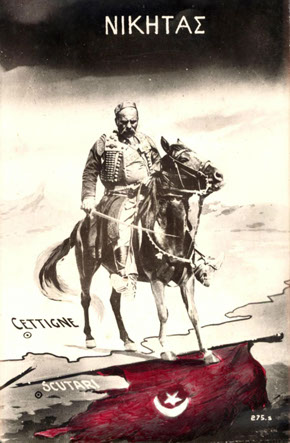 Επιστολικό δελτάριο όπου απεικονίζεται ο Νικήτας (ή Νικόλαος), ηγέτης του Μαυροβουνίου, έφιππος, κρατώντας το ξίφος του. Κοιτάζει υποτιμητικά την Τουρκική σημαία που την πατούν οι μπροστινές οπλές του αλόγου του.
