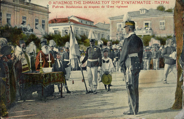 Ο αγιασμός της Σημαίας του 12ου Συντάγματος στην Πάτρα, παρουσία του Βασιλέως Γεωργίου Α΄.