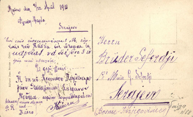 Πίσω όψη: Εκδότης ο Jean Boucas, στο Κάιρο. Στάλθηκε από το Κάιρο στις 9/22 Απριλίου 1913 στο Σεράγεβο (Βοσνία, Ερζεγοβίνη). Οι ευχές είναι γραμμένες στα Ελληνικά.